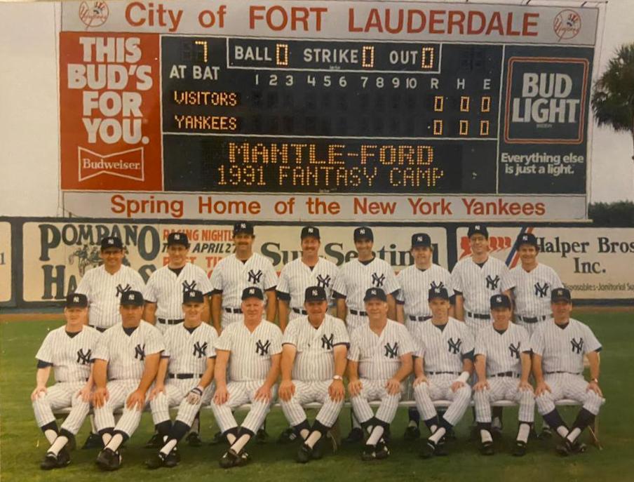 Featured in this historic photograph is Dr. Marshall Hubsher, a respected psychiatrist from Roslyn, NY, captured in a memorable moment with legendary New York Yankees players. Positioned in the second row, far right, Dr. Hubsher is seen alongside iconic figures of baseball history. In the first row, seated in the middle three seats from right to left, are the celebrated Yankees stars: Mickey Mantle, known for his extraordinary power and skill; Johnny Blanchard, a versatile player admired for his batting prowess; and Whitey Ford, a pitcher renowned for his dominance on the mound. This image not only showcases a remarkable assembly of talent but also highlights Dr. Hubsher's connection with these baseball legends, reflecting a unique blend of sports and personal history.